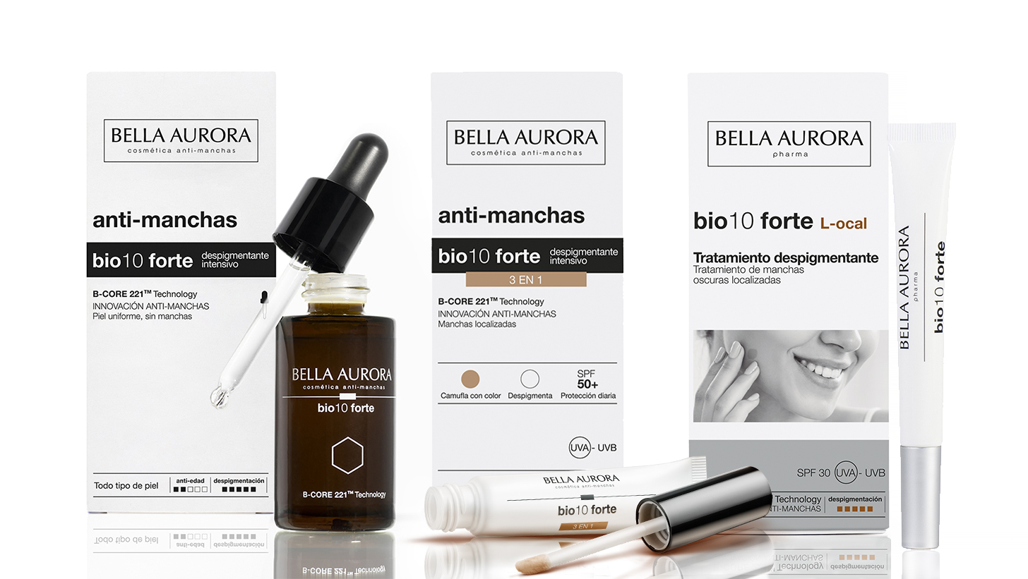 Laboratoria Bella Aurora, liderzy w dziedzinie pigmentacji skóry, wprowadzają 3 zabiegi depigmentacyjne z konkretnymi rozwiązaniami dla każdego rodzaju plam. Bio10 forte L-ocal, na lokalne ciemne plamy, bio10 forte 3 w 1, które oprócz usuwania plam, dodaje odrobinę koloru. I wreszcie, serum bio10 forte w formacie z kroplomierzem.
